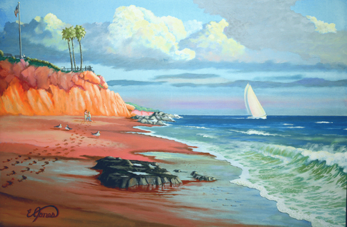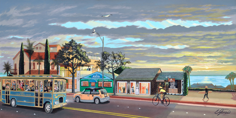 The painting depicts a fun time on the trolley at Cress Street and Pacific Coast Highway in Laguna Beach.
